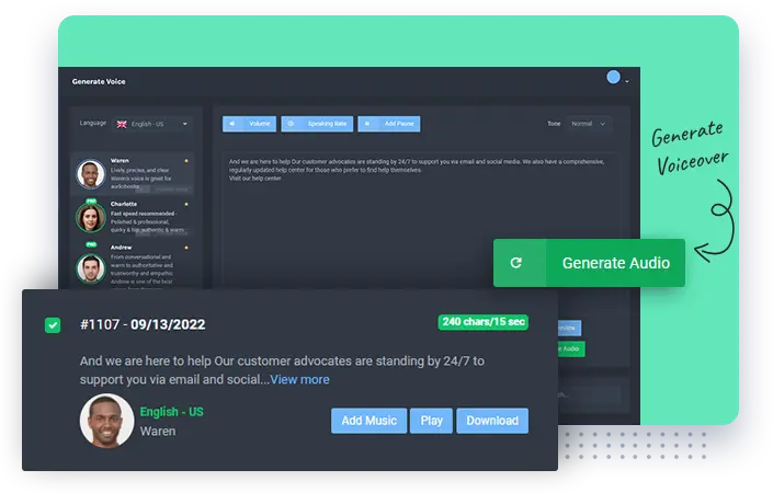 With a simple click on ‘Generate’, AI Awaaz advanced AI gets to work, creating a voiceover from the text you entered, in a voice cloned from your audio sample.